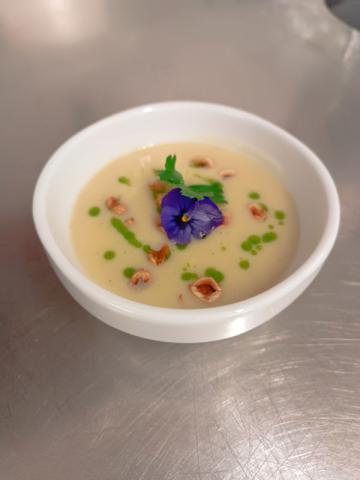 - Dressage : mixer le persil avec l’huile de colza et passer au chinois. Torréfier les noisettes et les concasser, parsemer la crème de céleri de gouttes d’huile de persil et d’éclats de noisettes. Ajouter une fleur comestible (cardamine, bleuet, coquelicot, etc.)