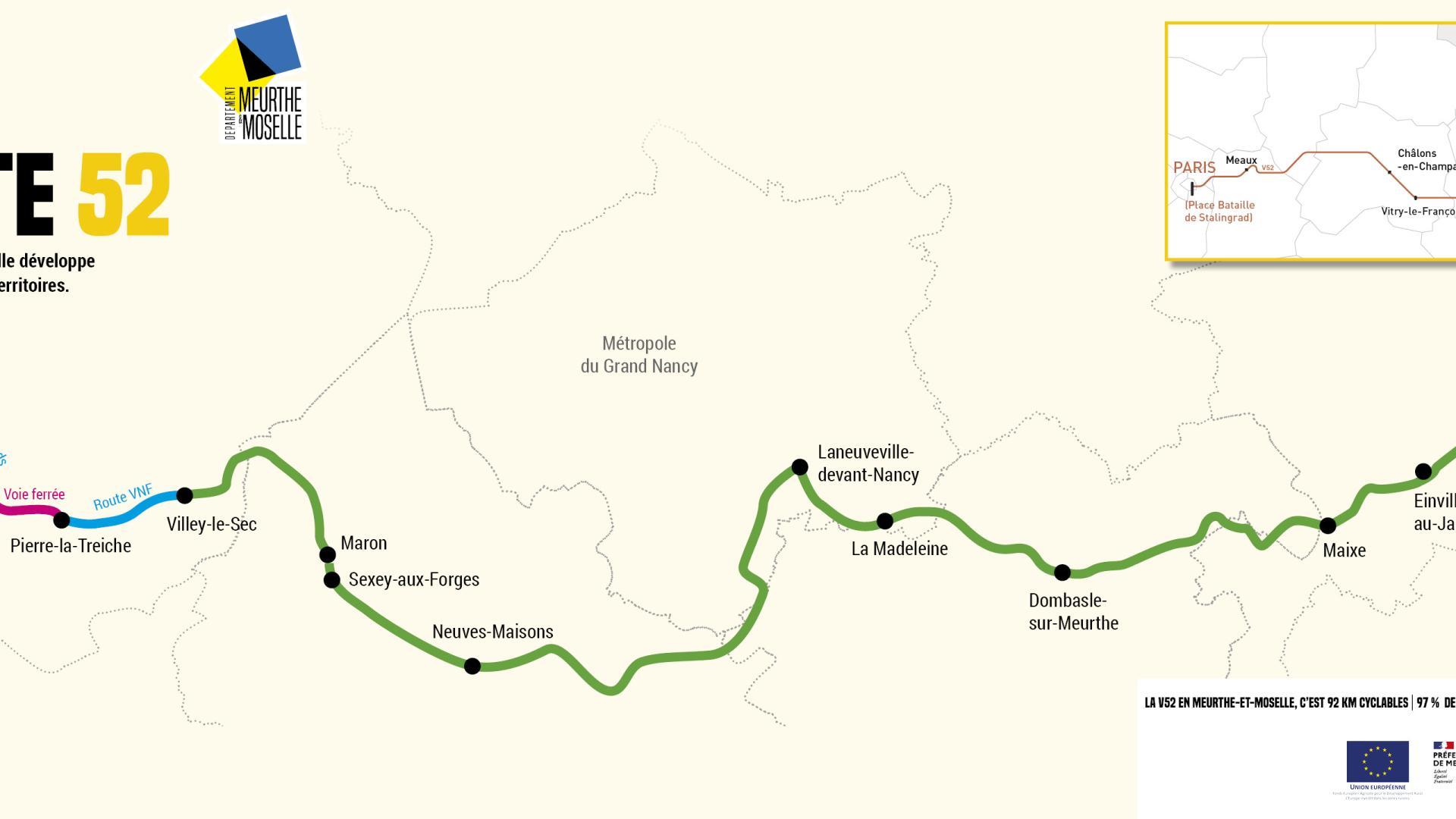 La V52 relie Paris à Strasbourg sur 549 km et traverse le Grand Est d’Est en Ouest sur 425 km. Cette véloroute occupe une position particulière au sein du réseau, car elle rejoint la Paneuropa Radweg (itinéraire Paris-Prague).