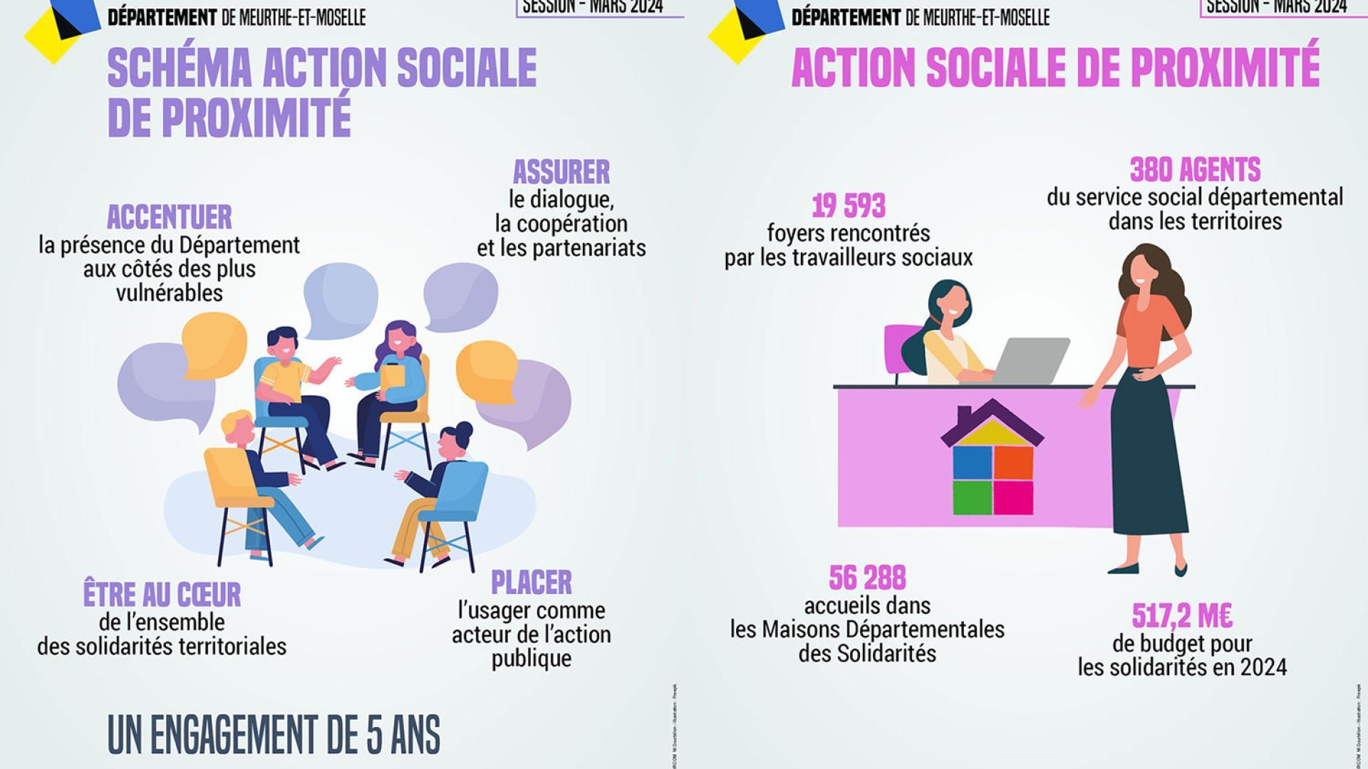Ce schéma montre aussi que les articulations avec les autres politiques départementales de solidarités (personnes âgées, personnes en situation de handicap, enfance, famille) sont nombreuses et incontournables : l’action sociale de proximité doit être inscrite à la croisée de l’ensemble des solidarités territoriales et au cœur des ressources humaines. L’action sociale de proximité en Meurthe et Moselle est mise en œuvre par les travailleurs sociaux et les agents administratifs.