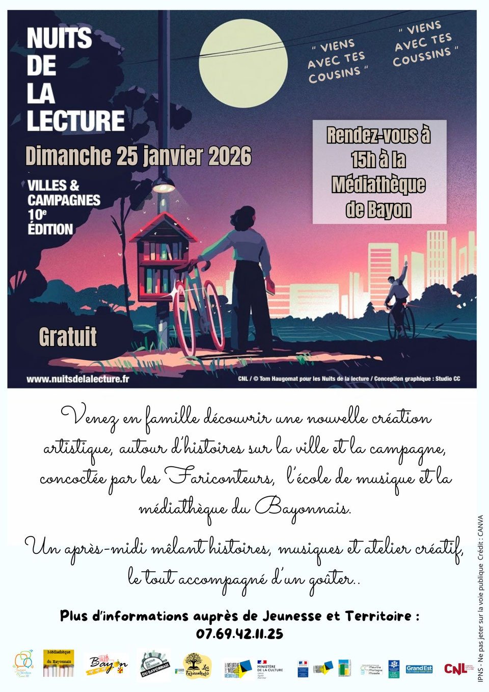 Les Nuits de la lecture sont organisées pour la cinquième année consécutive par le Centre national du livre sur proposition du ministère de la Culture. La médiathèque départementale accompagne les bibliothèques dans cette aventure en proposant des interventions artistiques, un soutien technique et/ou financier et du prêt d’outils d’animation.